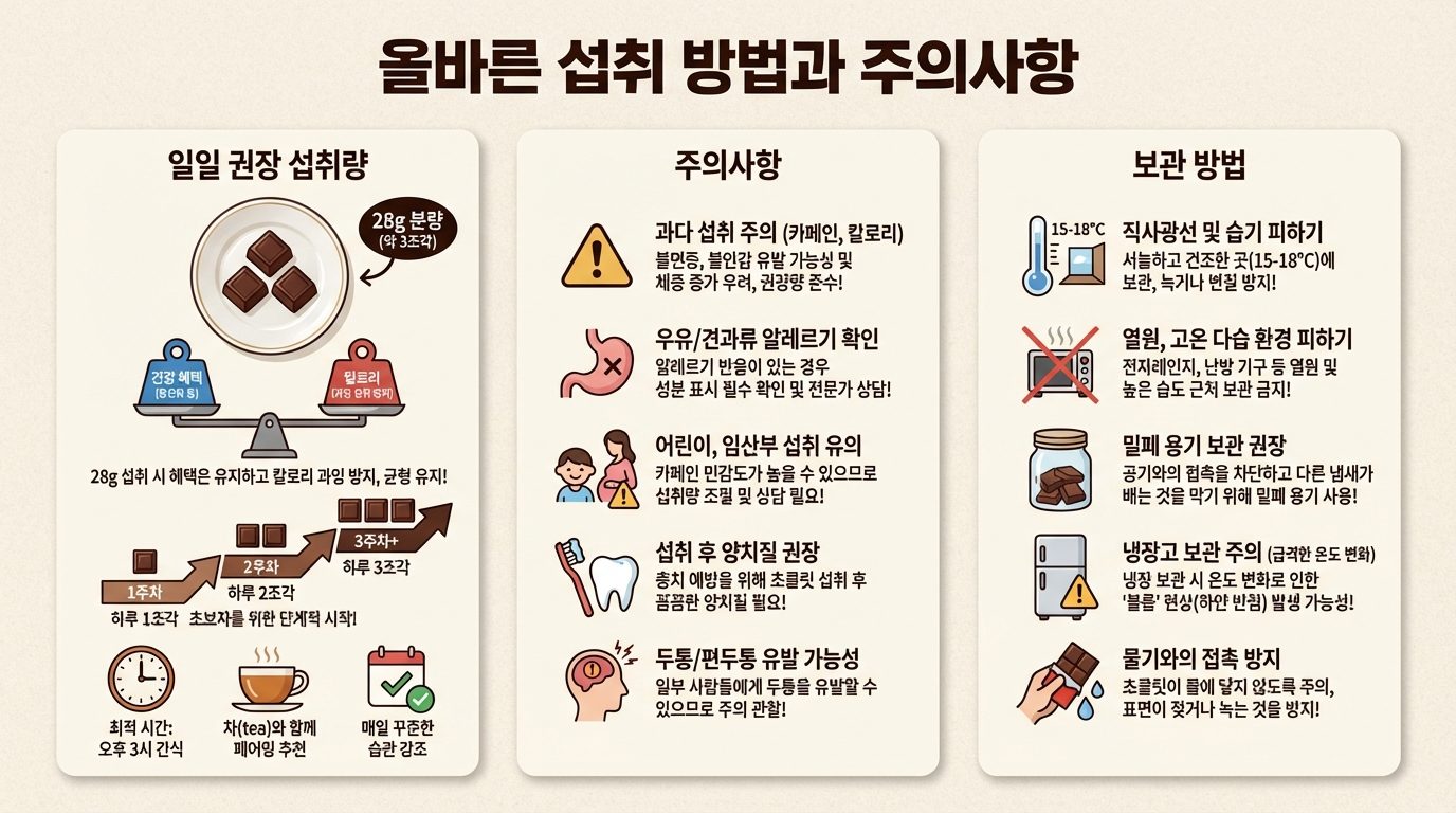 다크 초콜릿의 하루 권장량은 약 28그램, 즉 3조각 정도예요. 이 정도 양이면 건강 효과를 기대하면서도 칼로리 과다 섭취를 피할 수 있습니다. 처음 시작하는 분들이라면 조금 적게 시작해서 몸의 반응을 봐도 좋아요.