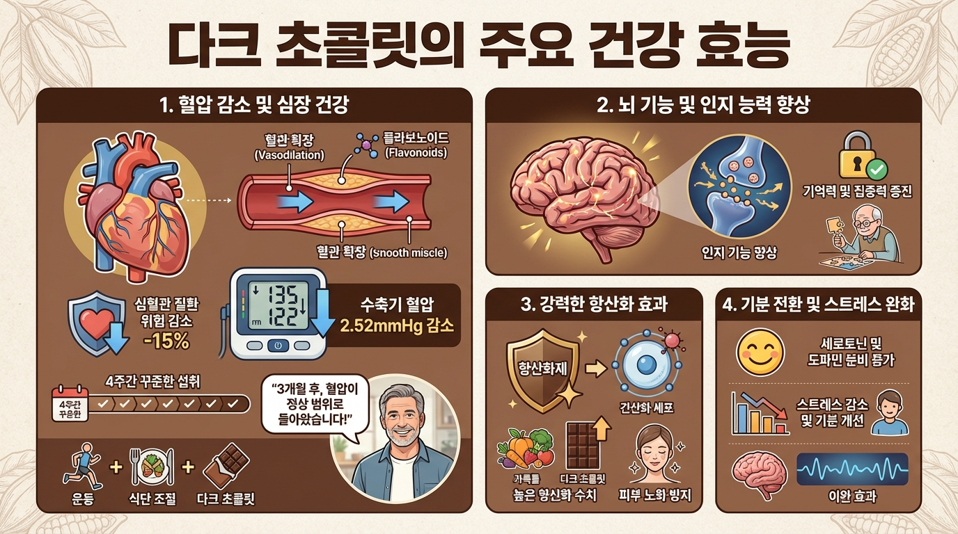 다크 초콜릿은 단순한 간식이 아니라 건강 식품이에요. 혈압 저하, 혈당 조절, 항산화, 뇌 건강 개선 등 여러 효능이 과학적으로 입증되었습니다. 하지만 핵심은 '적정량'이라는 거예요.